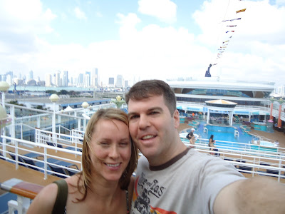 Off to Miami Port to catch our cruise! We got on the boat around noon after taking a red eye to North Carolina, then to Ft. Lauderdale, then a bus to Miami...that much travelling sucked, I'm ready to be on vacation! We changed in our suits at the airport so we were ready for the boat.